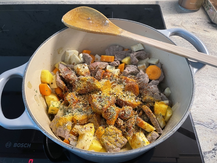 Добавить овощи к мясу, туда же специи и хорошо перемешать. Обжаривать минут 5 на сильном огне.