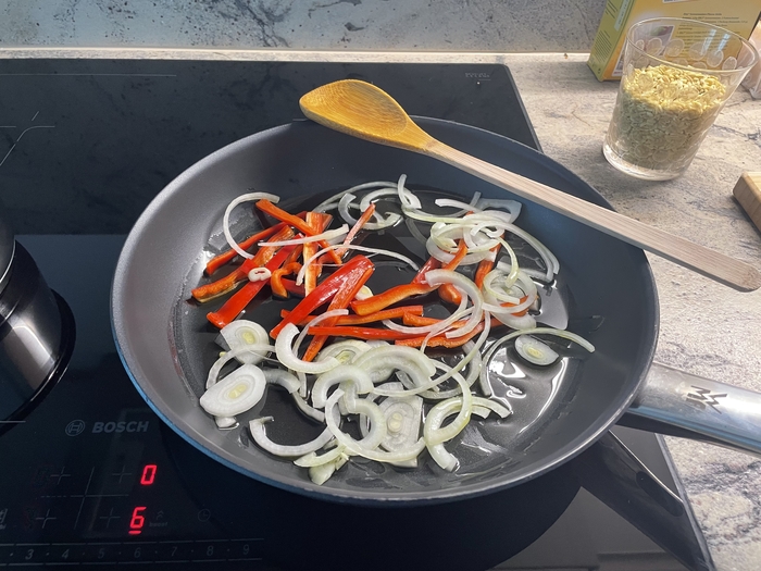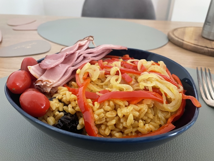 Выложить на тарелку, сверху положить перец и лук. Я добавил себе несколько кусочков ветчины и несколько помидоров.