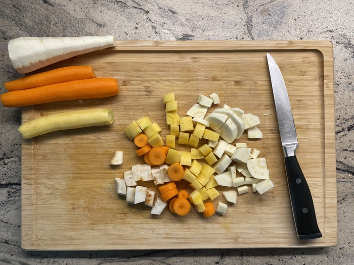 Овощи почистить и порезать. Обычно, врежу крупнее, но сегодня решил сделать помельче. Потому что блюдо будет не самостоятельное, а к рису.
