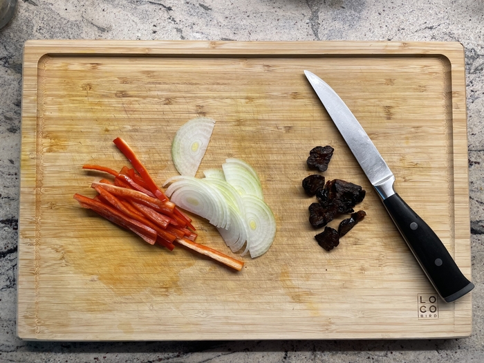 Перец порезать длинными полосками, а лук полукольцами. Чернослив можно порезать как угодно.
