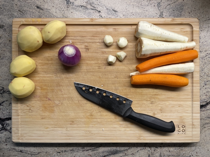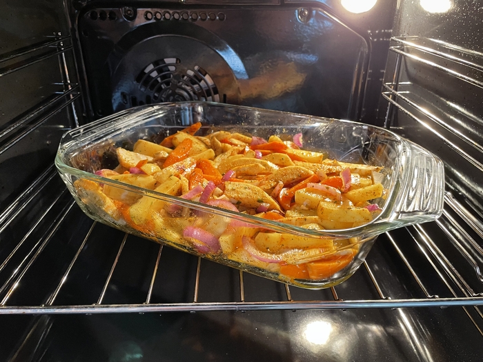 Нарезать овощи на удобные для рта куски. Я старался сделать что-то вроде крупной соломки. Потом заложить в удобную форму и запечь с травами и специями.