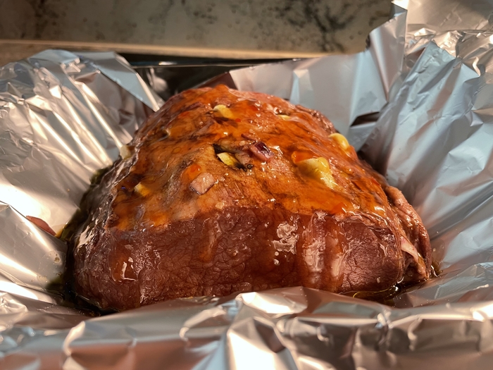 Достать мясо из «раствора», сделать ножом дырочки, запихнуть туда чеснок. Сверху табаско, рыбный соус и оливкое масло. Закрыть фольгой и в духовку. На час на 180-190 градусов. В конце я тоже засунул его на 5 минут под гриль для корочки.