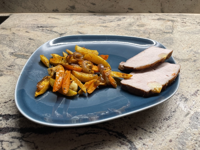 Вышел просто офигенный и сочный кусок мяса с чуть сладковатым и пикантным привкусом. Очень ароматный! С овощами заходит только так. Я еле удержался, что бы не слопать все 600 грамм