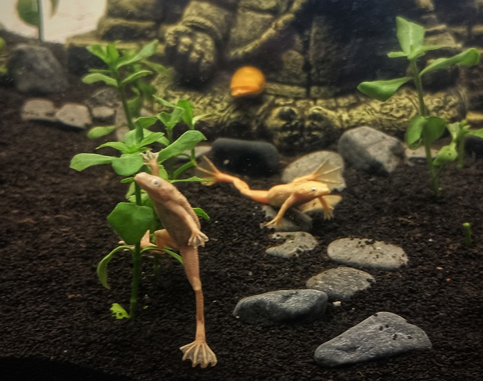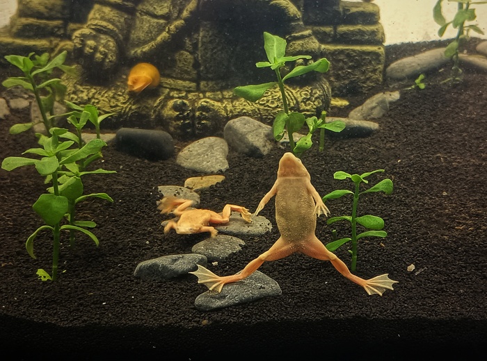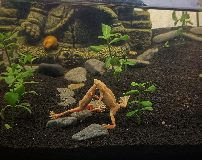 И вот три улитки переехали к лягушкам. А те едят мотыля, и в их аквариуме ещё немного растений высажено. И улитки на этом мотыле знатно вымахали. А в свободные от кормёжки лягушек дни улитки объедают растения.