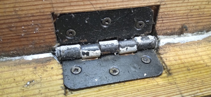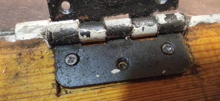 Как вы знаете, почти все советские крепежные изделия с годами только приобретают в качестве и всегда превосходно откручиваются. Кто хоть раз с этим сталкивался поймет меня, особенно если есть с чем сравнить. Тутошние метизы не стали исключением – какие-то шурупы открутились, какие-то не поддавались вовсе, я пытался их высверлить единственным подходящим тупым сверлом, но в итоге решил проблему, подцепив всю петлю снизу и вытащив вместе с крепежом.