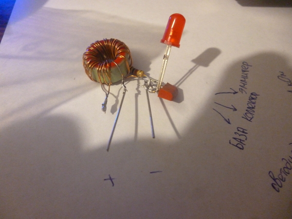 Основной элемент схемы - накопительный дроссель. Дроссель - крайне принципиальный элемент,он любит стабильность и люто ненавидит,когда меняется ток в цепи. А транзистор, в паре с обмоткой обратной связи, путают ему карты и то и дело выключат ток. И тут нашему маленькому, но ОЧЭНЪ гордому дросселю ничего не остается, кроме как,поддерживая ток в своей цепи, пройти через светодиод, увеличив напряжение до необходимого для светодиода. По этой же причине нельзя включать схему без нагрузки (светодиода), потому что оказавшись один на один с ненавистным транзистором, дроссель просто пробьет его и будет наслаждаться стабильностью=)