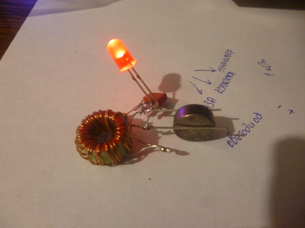 И все получилось,3В светодиод зажегся от севшей батарейки-таблетки 1,2В: