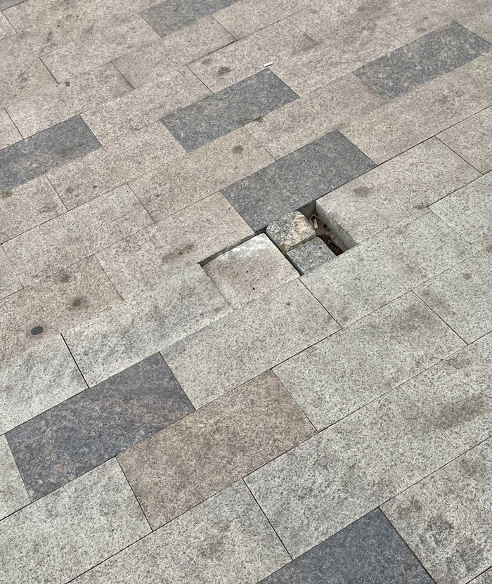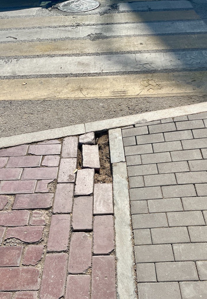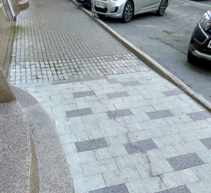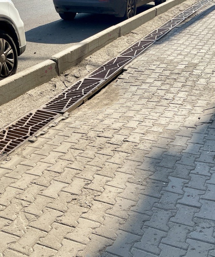 Тут была проблема, во время дождей в ливневку не попадала вода, скапливалась на тротуаре( Но проблема не проблема — просто слегка-а-а-а опустили сам тротуар, теперь вода идеально затекает куда нужно, ножки сухие