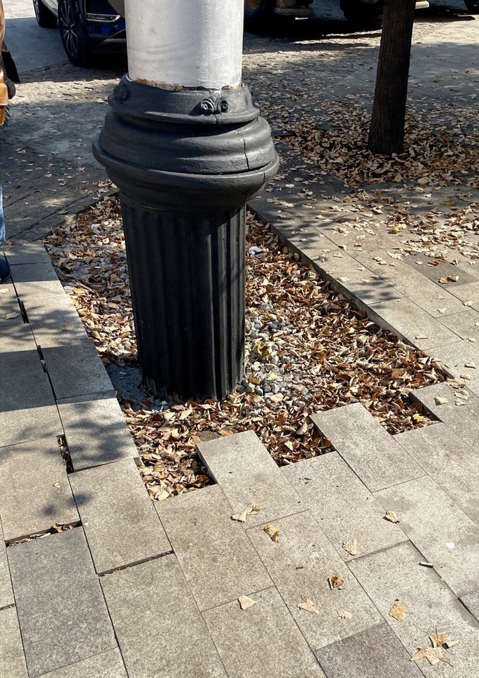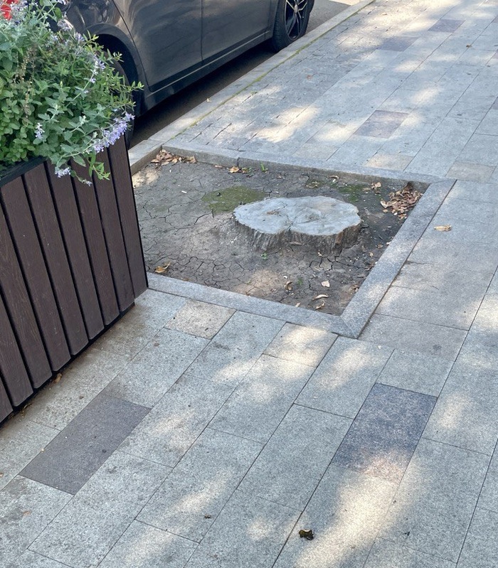 Новое — это хорошо забытое старое. Поэтому, чтобы мы не забывали о старом, некоторые деревья решили не высаживать заново — просто спилили, оставив корневую систему в земле. Вполне нормально и симпатично
