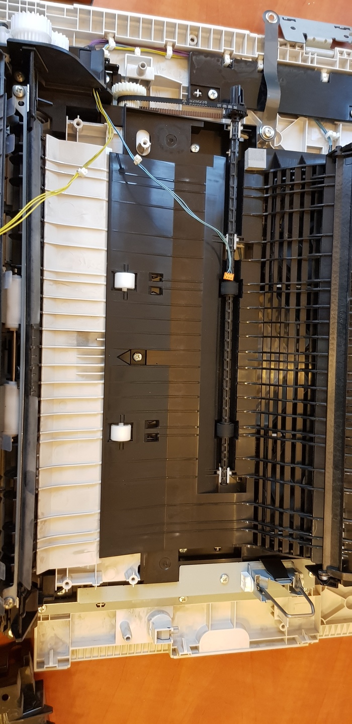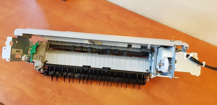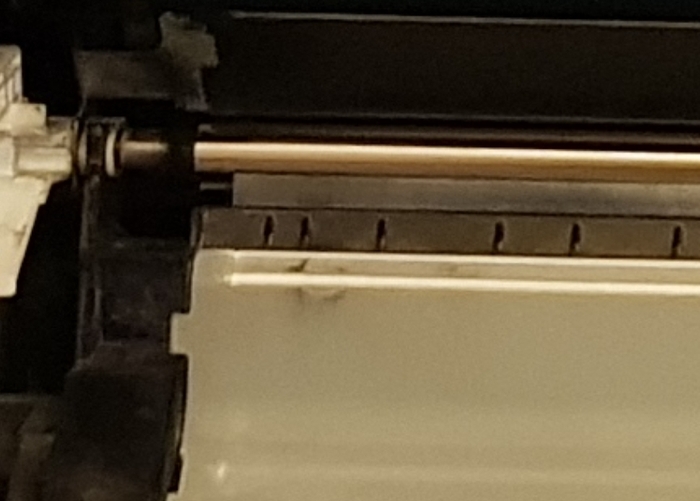 Проверяю магнитный блок, друм и печку (не фоткал - руки были слишком грязные). На друме уже "дырки" вне печатной площади (видны кляксы на пробной распечатки, когда бумага изза перекоса вышла за предел) что означает что через 20-30К придется менять, похожее наблюдалось и на печке - на концах покрытие протерлось до металла, тоже срок 20-30К.