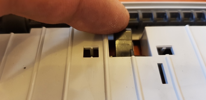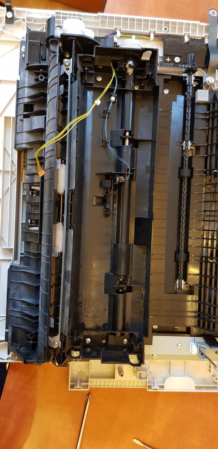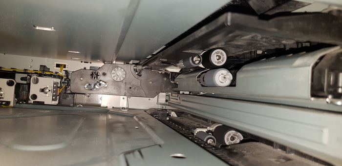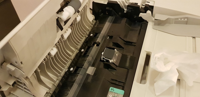 Продуваем DADF сжатым воздухом и чистим ролики и отделяющую фигню (pad, не знаю как переводится на русский) платенклином.