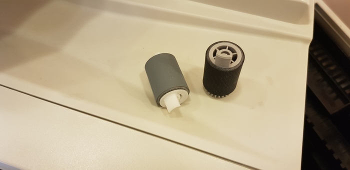 Затираем вмятину наждачкой, чистим все поверхности спиртом и протираем силиконовым маслом, тем же маслом обрабатываем втулки осей роликов и оси пластмассовых роликов. Резиновые ролики чистим платенклином. Всё собираем и ставим в аппарат.