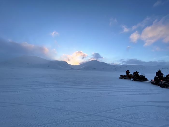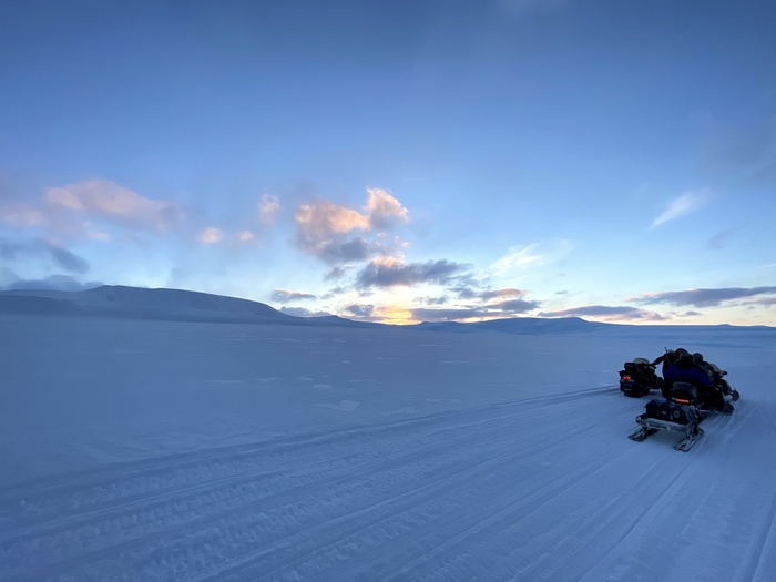 По этой же причине солнце мы увидели в пути, по приезду в Баренцбург оно уже почти село. В пути группа часто делает остановки для того, чтобы проверить снаряжение, поправить слетевшие очки, перчатки, да и просто передохнуть от темпа езды. Мы ехали со скоростью 70-75 км/ч, что для снегохода очень много, лично я около 5 раз чуть не перевернулся, когда лыжа ловила соседнюю колею.