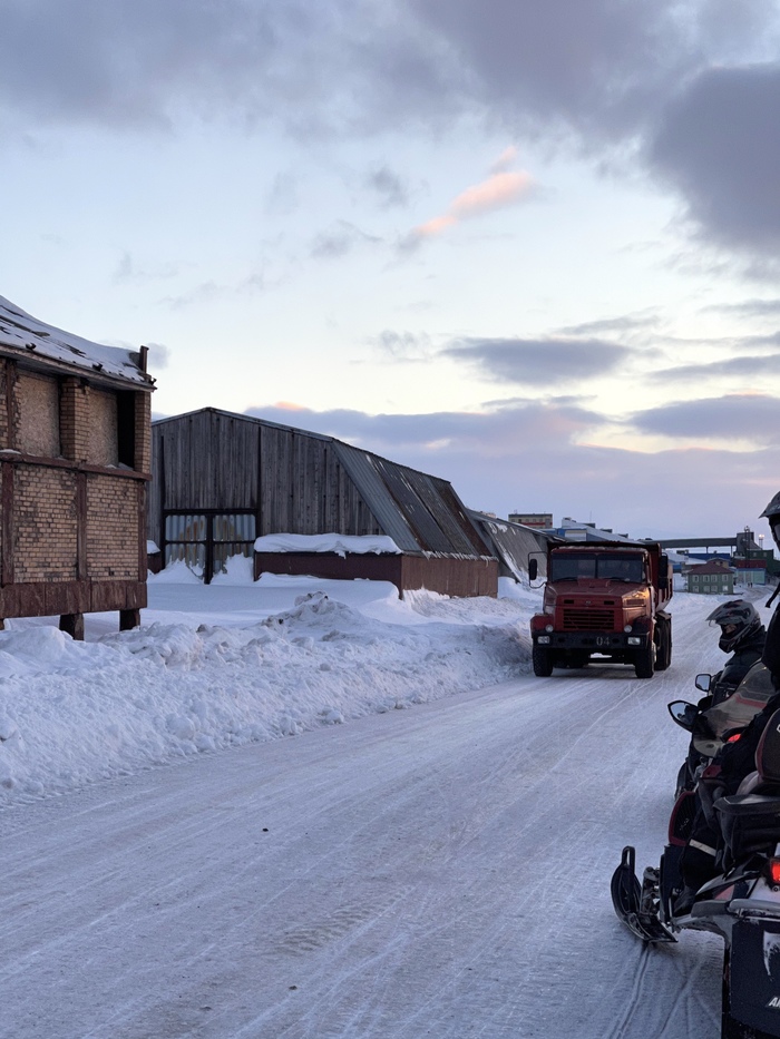 В Баренцбурге нас встретил местный КрАЗик, который днем и ночью вывозит шлак с электростанции:
