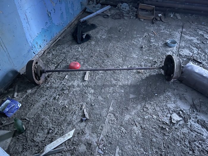 Фото из, видимо, спортзала. Штанга, сделанная из колесной пары: