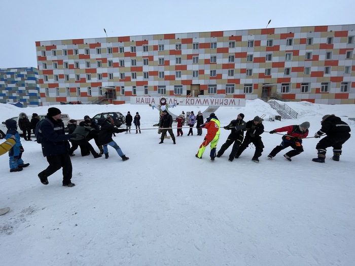 А на этой фото - перетягивание каната. Слева жители Баренцбурга, справа - Лонгйира. На заднем плане два здания с квартирами для работников Арктикугля.