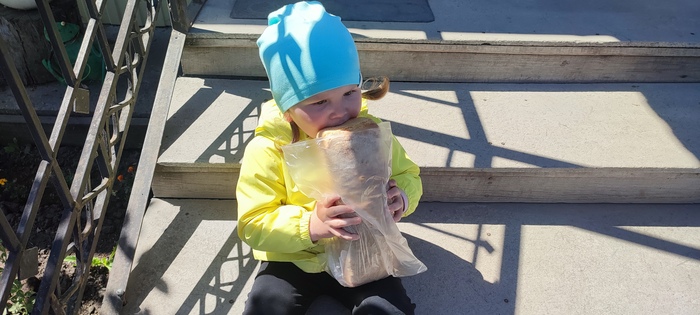 Итак, дано: дочь почти 3 года, во всем помогать старается. Пошли гулять, зашли в магаз, хлеб как раз привезли. Кричит "я понесу!". Ну ок, помогай. Вышли, тут же села на ступеньку и ..
