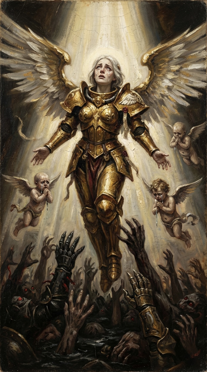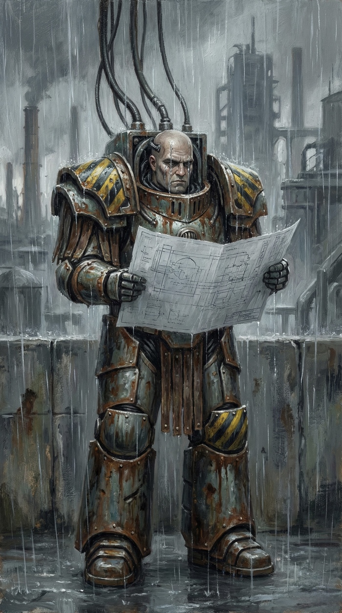 В общем я случайно сделал двух рандомных космодесов и мне понравилась композиция, так что я по-быстрому сменил их на примарха и импи. Однако модели Дорна под рукой не было, поэтому я сгенерировал промптом белобрысого кулака