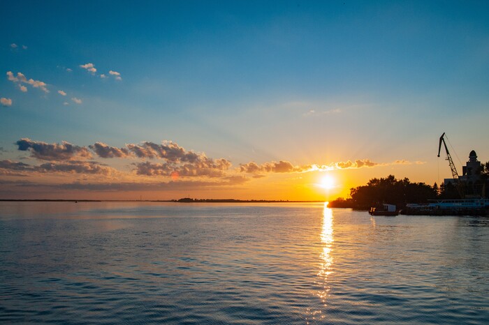 Закат на широком месте реки.