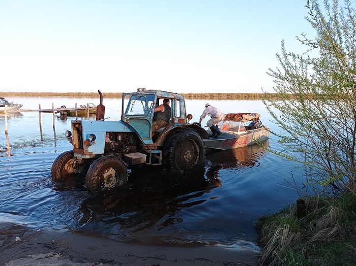 И вот! Весна 23 года, мы с друзьями спускаем Прогресс. Спасибо огромное местному жителю, Дяде Володе, помог дотащить трактором. Ну и спасибо Деду что сохранил комплект колес заводских от катера. Катер после прикручивания колес и фаркопной дуги (дышло? не знаю как правильно называется) превращается в катер-тележку. Замечательное инженерное решение.