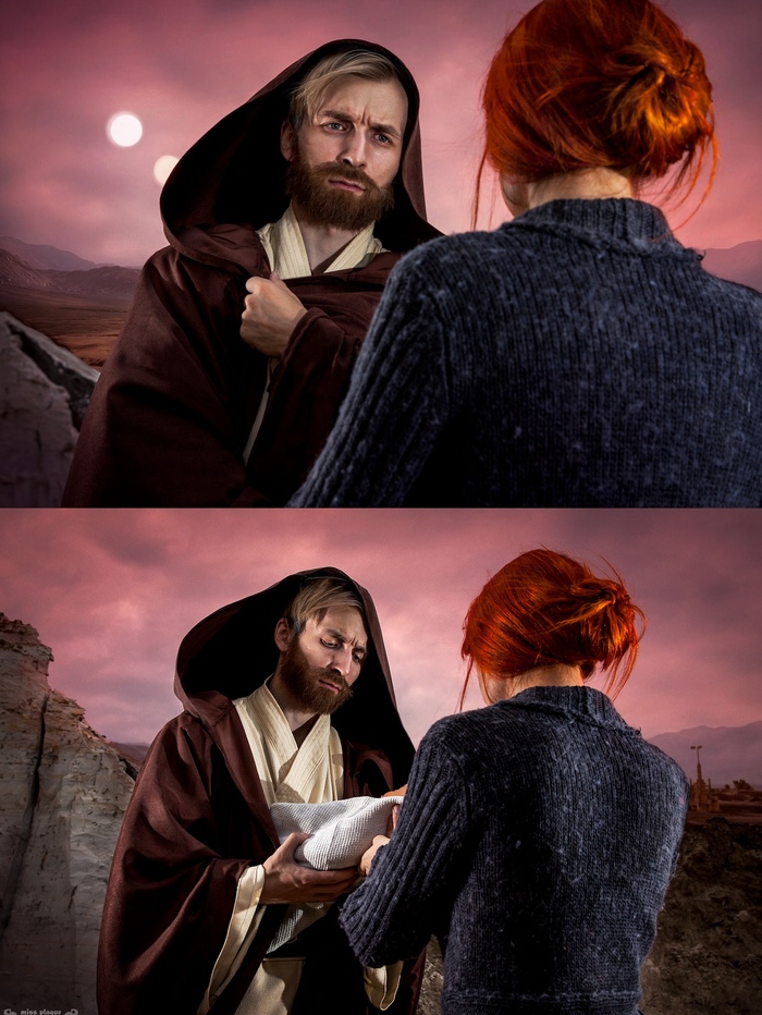 Оби Ван передает малыша Люка приемной матери Беру Ларс. Мы попытались воссоздать сцену перед титрами "Месть ситхов".
