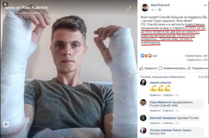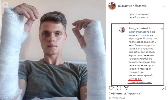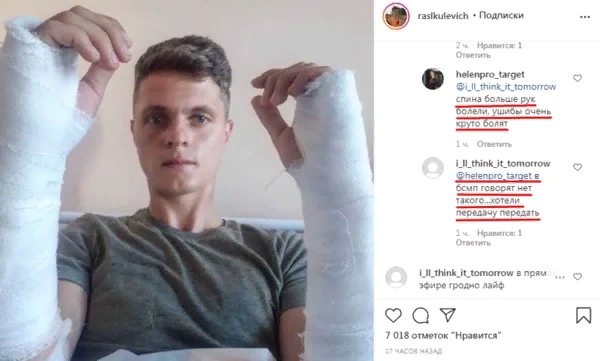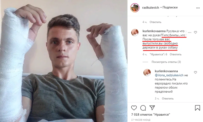 Комментаторы недоумевают, как он сломанными руками держал собаку на руках сразу после выхода из СИЗО. Также появилось сообщение о госпитализации, но гродненцы не обнаружили его в больнице.