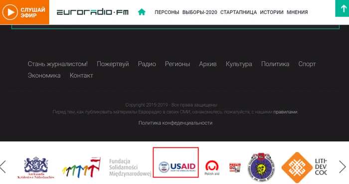 На странице этого СМИ красуются логотипы спонсоров из USAID - известный провокатор цветных революций Госдепа США, и россыпь чешских, польских и литовских организаций.