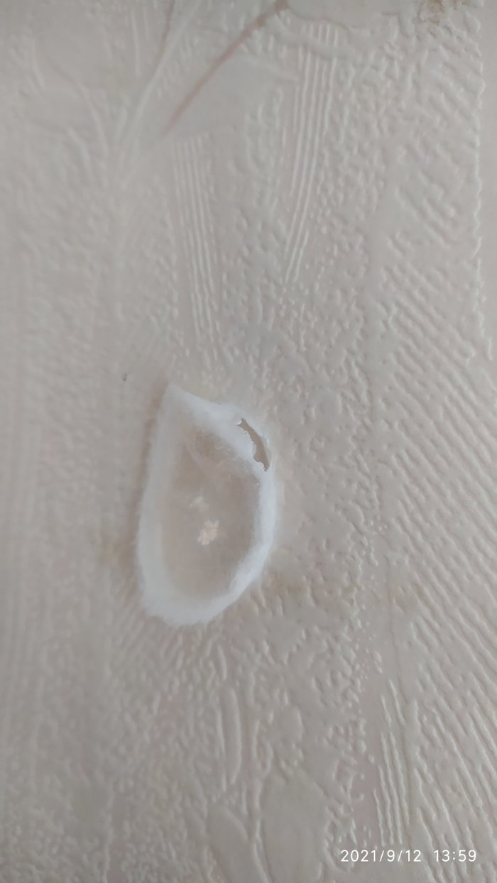 Давеча снял картину со стены, и за ней что-то обнаружилось. Снимал вечером, свет не стал включать, подумал, что скотч двухсторонний. С утра смотрю - вроде вата какая-то. Ну да и хрен с ней, ещё пару дней не обращал на это внимания. А потом что-то подумалось, что это плесень таким ведьминым кругом заколосилась. Пригляделся и увидел, что это вообще какое-то гнездо, причём из него уже кто-то выполз. Чьё это обиталище могло быть?