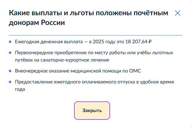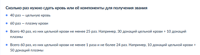 Личной мой путь в почетное донорство составил 13 лет, так то я планировал за 10. Для тех кто не в курсе, надо или 40 цельной или в перемешку с плазмой, вставлю картинку с госуслуг: