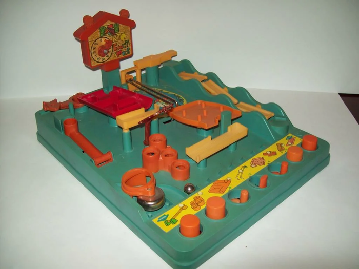 называлась "Кто быстрее?". Железный шарик преодолевал препятствия, а заведённый таймер фиксировал время каждого игрока. Кнопки управления отправляли шарик в лабиринты, лунки, движущиеся дорожки и рельсы, это была какая-то магия!! Последний этап отправлял шарик катапультой прямиком в лунку со звонком, который оповещал о конце игры. Сказать, как я любила эту игру - не сказать ничего. К сожалению, пока мы с сестрой были в летнем лагере, мама прибиралась в нашей комнате и часть игрушек и игр, из которых мы выросли, как она себе представляла, она вынесла на помойку.