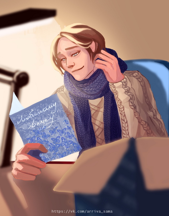 Надеюсь, передаваемый месседж понятен: у персонажа есть бабуля, с которыми они в очень теплых отношениях. Ну и да, шарф у него мелькал на нескольких картинках - почему бы не дать ему историю? Чтобы это была не просто шмотка, а подарок любимой бабушки.