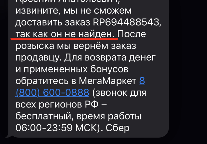 UPD #2 04.01: сообщение от номера 900 с подтверждением пропажи) заказ все еще числится в активных в личном кабинете. Волеизъявление на получение денежных средств я не давал. Поэтому завтра отправляю досудебную претензию, по причине расторжения публичного договора в одностороннем порядке со стороны продавца, что недопустимо законом.