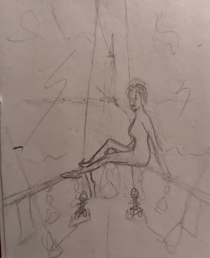 Мне всегда хотелось приблизить к реальности и другое событие из жизни пепельноволосой девушки. Но оно настолько эмоциональное, что я не смог доверить этого никому. Последний раз, я рисовал 6 лет назад, и то на дисплее. Нынешний опыт должен был стать исключительным, поэтому я пошёл в магазин, помучил расспросами работницу зала, купил себе кисти, акриловые краски и холст. Дома, я реквизировал у дочери мольберт, палитру и стаканчики, оборудовал скромную мастерскую😅 и принялся ваять! Изначальный эскиз я оставлю в послесловии, на сладкое:)