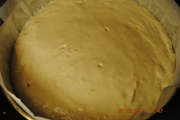 Выкладываем бисквит в форму ,но сразу в духовку не ставим,а даем ему подышать минут 10,20 о том,что пора выпекать скажут лопающиеся пузырики появившиеся на тесте.