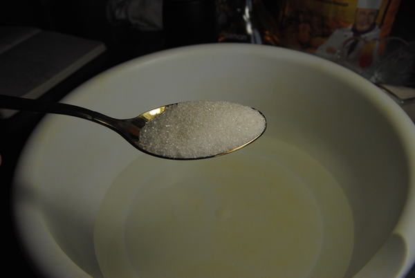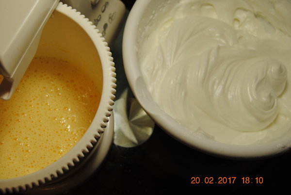 Далее взбиваем желтки и постепенно высыпаем половину сахара,потом также взбиваем белки и добавляем в них оставшийся сахар