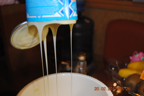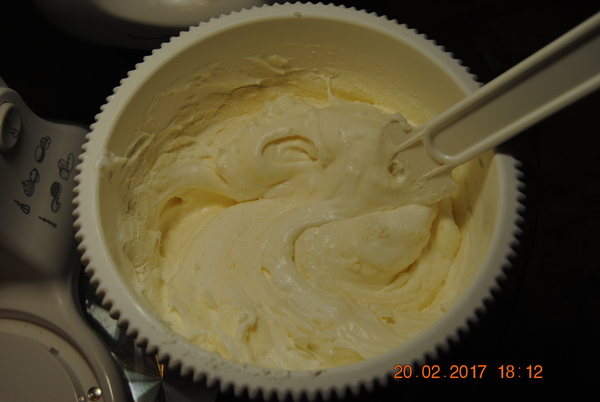 потом вводим в эту смесь муку (я вводил в три приема)причем миксером взбивать не надо,а только руками,добавляем ванильный сахар.Вот такой консистенции получается тесто