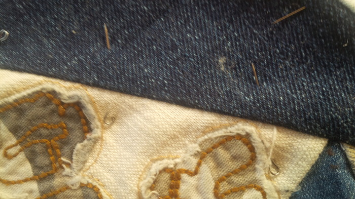 Дальше выкроила по размеру синтепон, сколола булавками с лоскутными элементами и выстегала отделочной строчкой. Потом приклеила к картону. Приклеила по всей поверхности и сделала неправильно, потому что клей просочился через синтепон на лицевую поверхность и остались видны пятна. Будем надеяться что когда приклеится и просохнет пятен видно не будет. Поэтому сделала вывод, что клеить надо только по периметру, проклеивая 0,5 см от края.