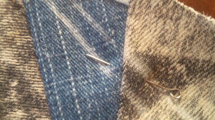 Потом выкроила из джинса полоску по долевой нитке ширина 4 см. и длина, как высота основного шаблона. Проклеила края по периметру и получилась как бы джинсовая подкладка с изнаночной стороны. А с лицевой стороны, там где между плетением есть дырочки проглядывает джинсовая ткань. На мой взгляд - очень даже ничего:)