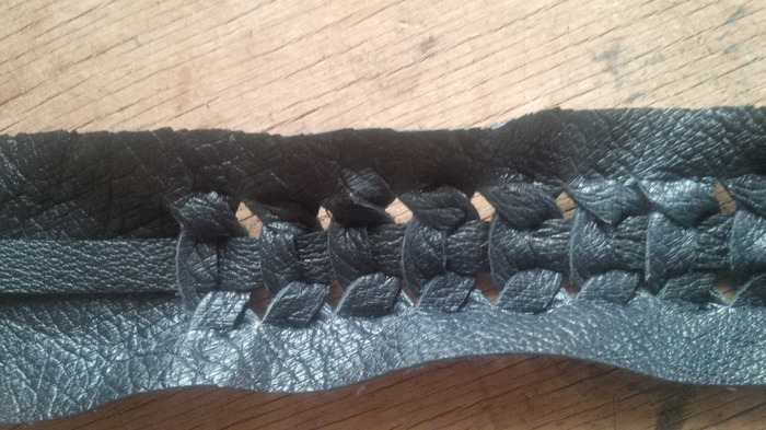 Дальше, что бы сделать переплет - выкроила из кожи две поски: одну полоску на 4 см. длиннее от высоты шаблона (2 см. припуск вверху и 2 см. припуск внизу) с шириной 4 см. Другую - шириной 1 см и длиной по высоте шаблона. Отступила немного сверху и снизу и сделала поперечные прорези по 0,7 см. отступая от боковых срезов на 1 см.