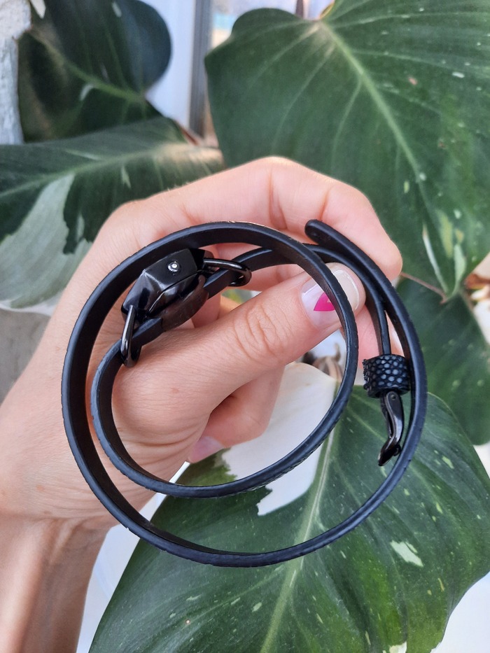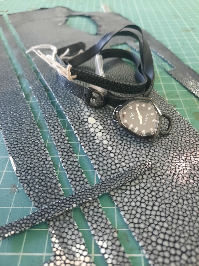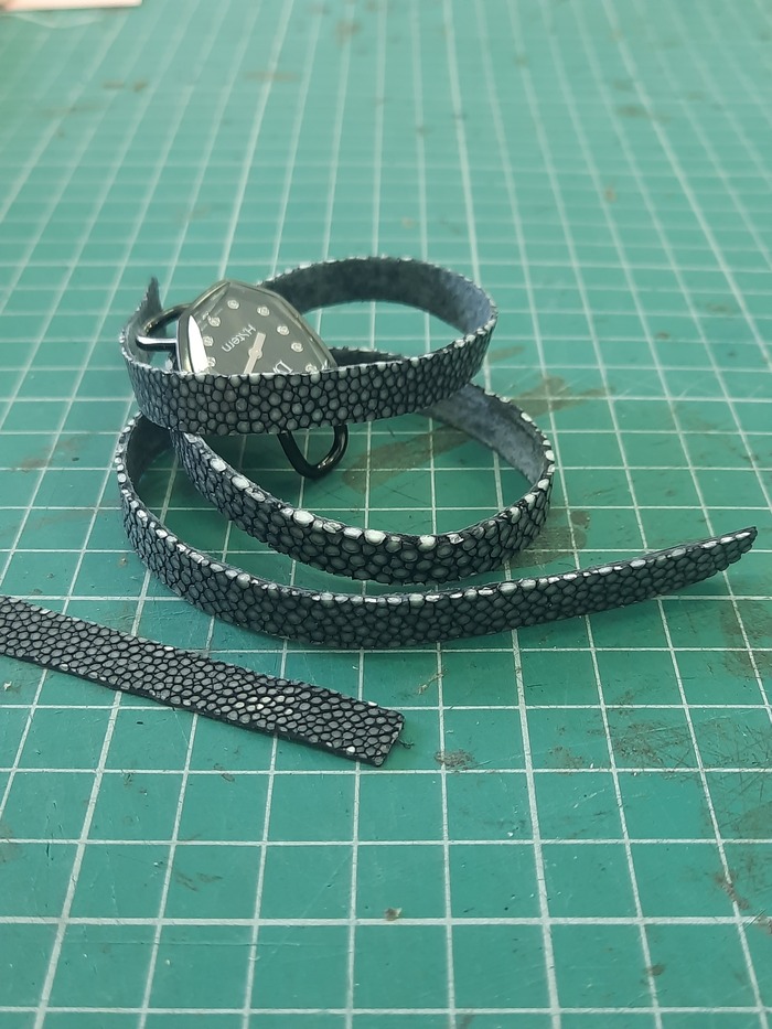 Обратилась ко мне клиентка Ольга, 5ть лет назад делала для неё сложный ремешок из кожи морского ската в 2 оборота. Вот он на фото, активно использовался 5 лет. В чем сложность? А в том, что в корпусе есть прорезь, в неё должен пройти ремешок, это раз)) а два- ремешок 12мм, при шлифовка на станке можно оставить пальцы 🙈 ну и 3, вырезать такую длину канцелярским ножом и ровно без форм, надо постараться)))