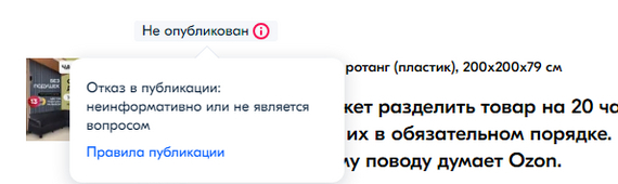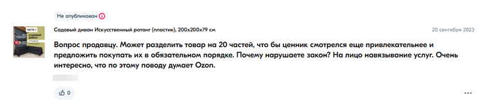 Господа-товарищи, этот пост будет интересен как людям, которые совершают покупки на озон, так и продавцам, размещающим товары на этой площадке. Сегодня столкнулся с очень интересной ситуацией - товар, которым заведомо невозможно пользоваться, не купив другой товар. И не было бы этого поста, если бы озон урегулировал бы это явное нарушение законодательства РФ, но на мой в меру язвительный вопрос я получил ответ "Отказ в публикации: неинформативно или не является вопросом"