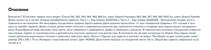 Пролистав еще 2 экрана можно увидеть описание, где шрифтом в 10pt достав лупу можно прочитать, что диван некомплектный и это обусловлено тем, что озон регулярно теряет вторую коробку. Т.е. еще и озон виноват, а бедному продавцу приходится так изощряться с продажей своего замечательного товара.
