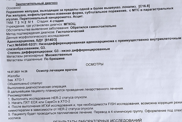 Еще в марте я начал жаловаться на дискофорт в животе, в мае при ФГДС определили рак, потом анализы еще раз перепроверили, потом всякие анализы/очереди/ожидания, 7 июля положили в больницу. Откачали жижу (Асцит), сделали диагностическую лапароскопию и вчера выписали и отправили к химиотерапевту.
