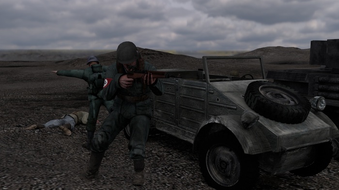 А нa земле дела плохи численное преимущество не за нами, злой немец с винтовкой, а за ним не "ригнутый" его друг.