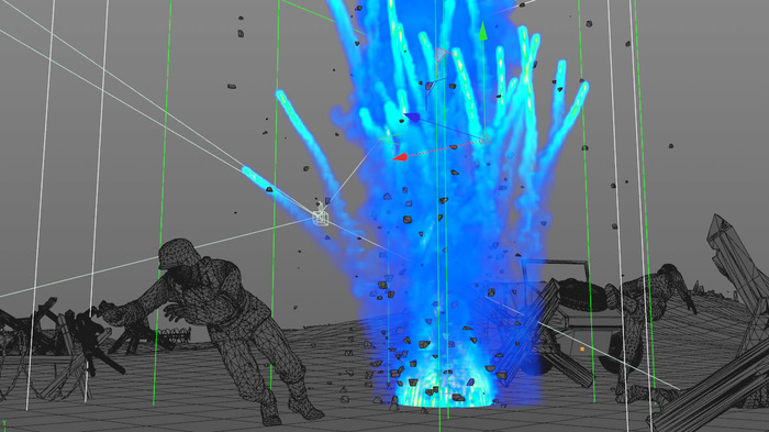 Опять ФД плюс эмитер, плюс нитробласт удар по полигональной сетке для кусочков камня/земли.