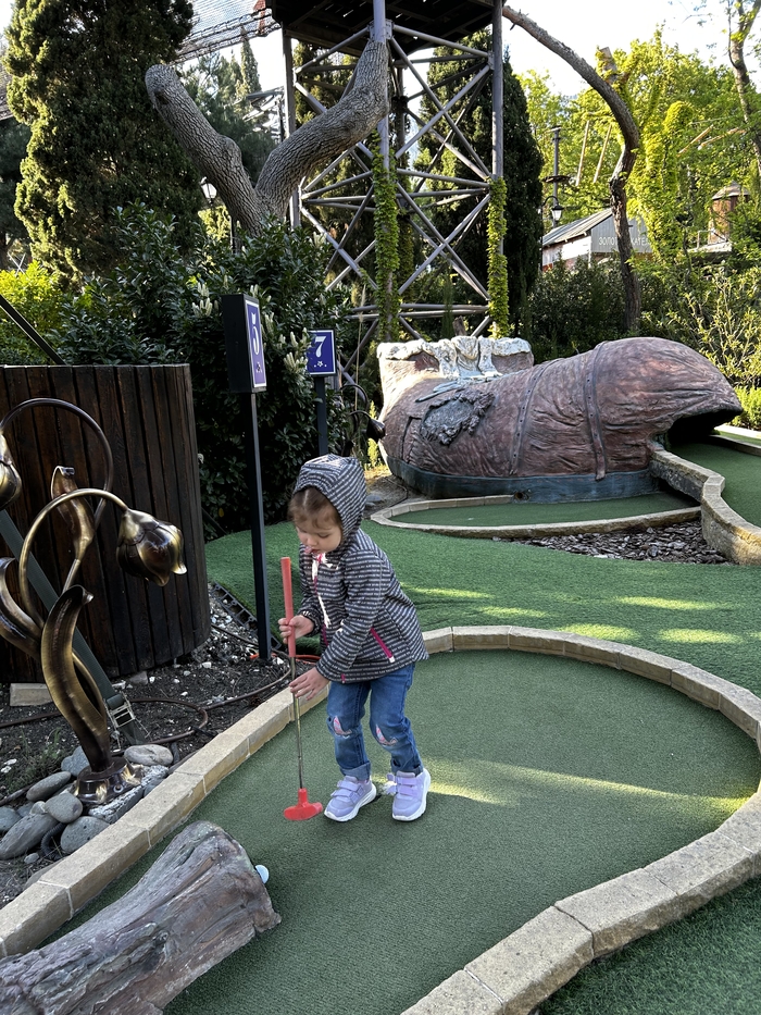 После еды дети пошли на локацию мини гольфа. Перед этим заскочили на 20 минут в 4Д кинотеатр.