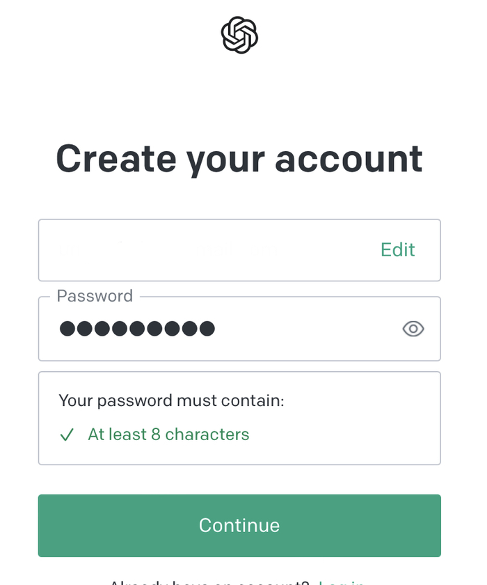 Попадаем на следующий экран для создания пароля к учетной записи, при этом пароль должен состоять минимум из 8 символов. Вводим пароль в поле Password и нажимаем на кнопку «Continue».