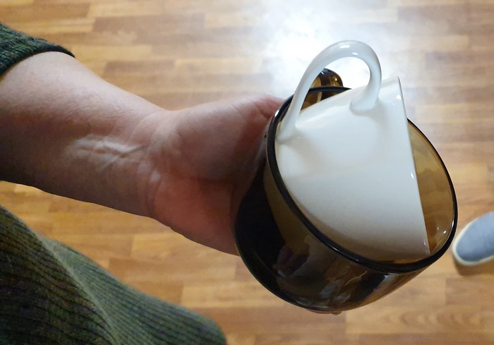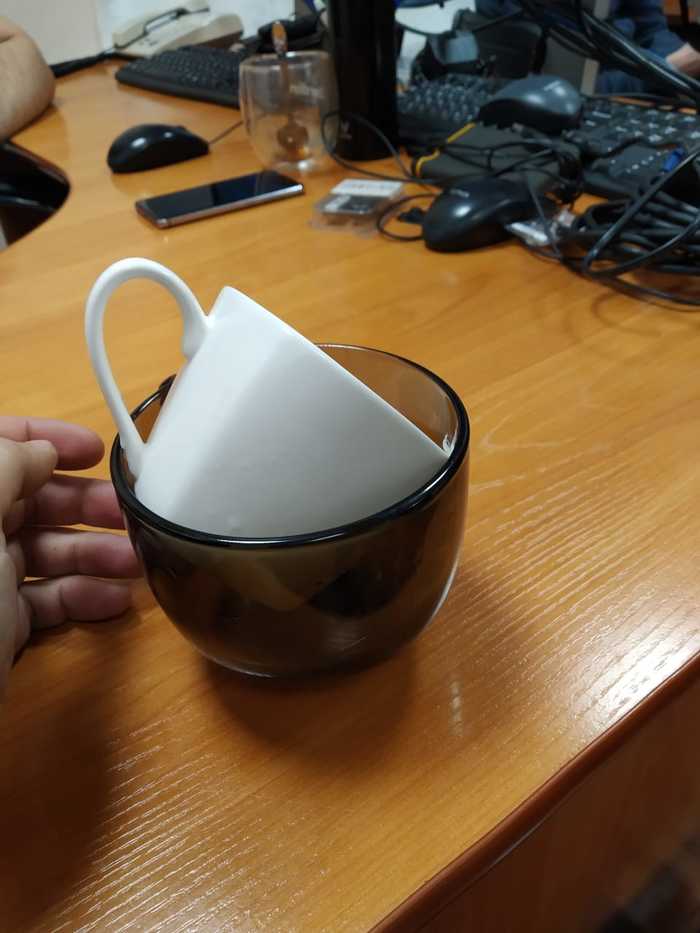 Каким-то чудесным образом кружка застряла в кружке, но мы же программисты, мы все можем, даже такое. Простым усилием рук вытащить пленника из темницы не получается.