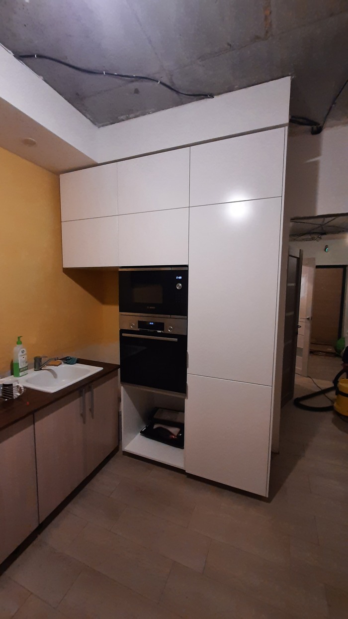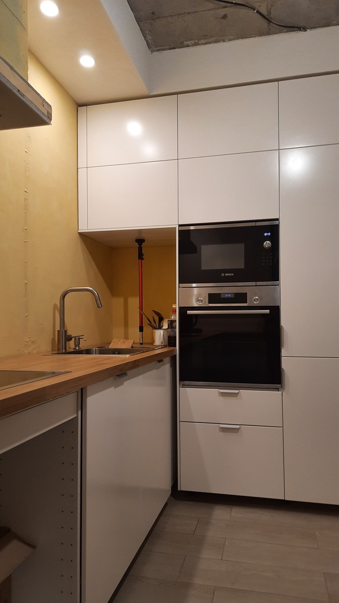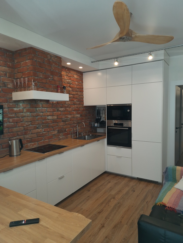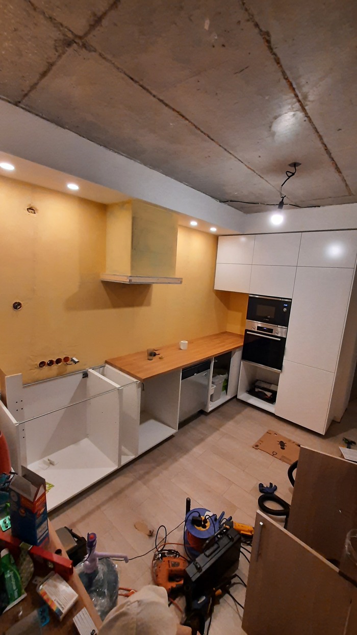 Обшил гкл и покрыл декоративкой. У вытяжки сформировал козырёк так, чтобы можно было ставить предметы интерьера/специи. До всех известных событий была куплена бытовая техника с хорошей скидкой.