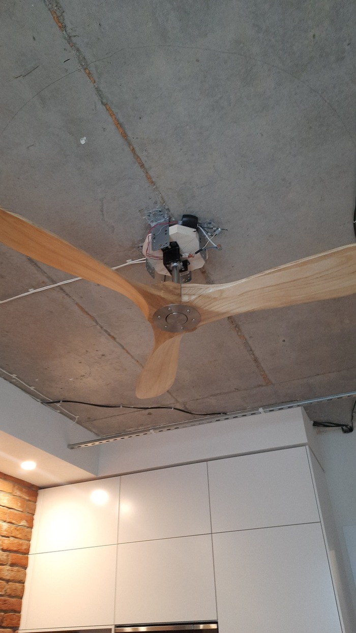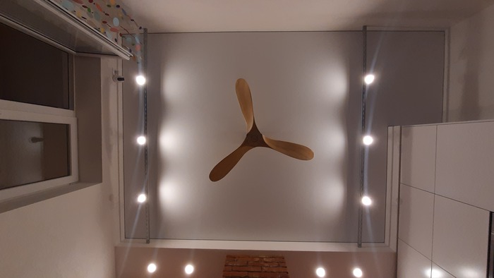 На известной зарубежной площадки был приобретён потолочный вентилятор с выводом под освещение. Как никак, летом столбик термометра доходит до 42 С°. Из спальни холодный поток воздуха от кондиционера плохо доходит. Вентилятор решает проблему циркуляции потоков воздуха и одновременно вносит изюм в общий интерьер. Проблему хорошего освещения решили установкой самодельной трековой системой.